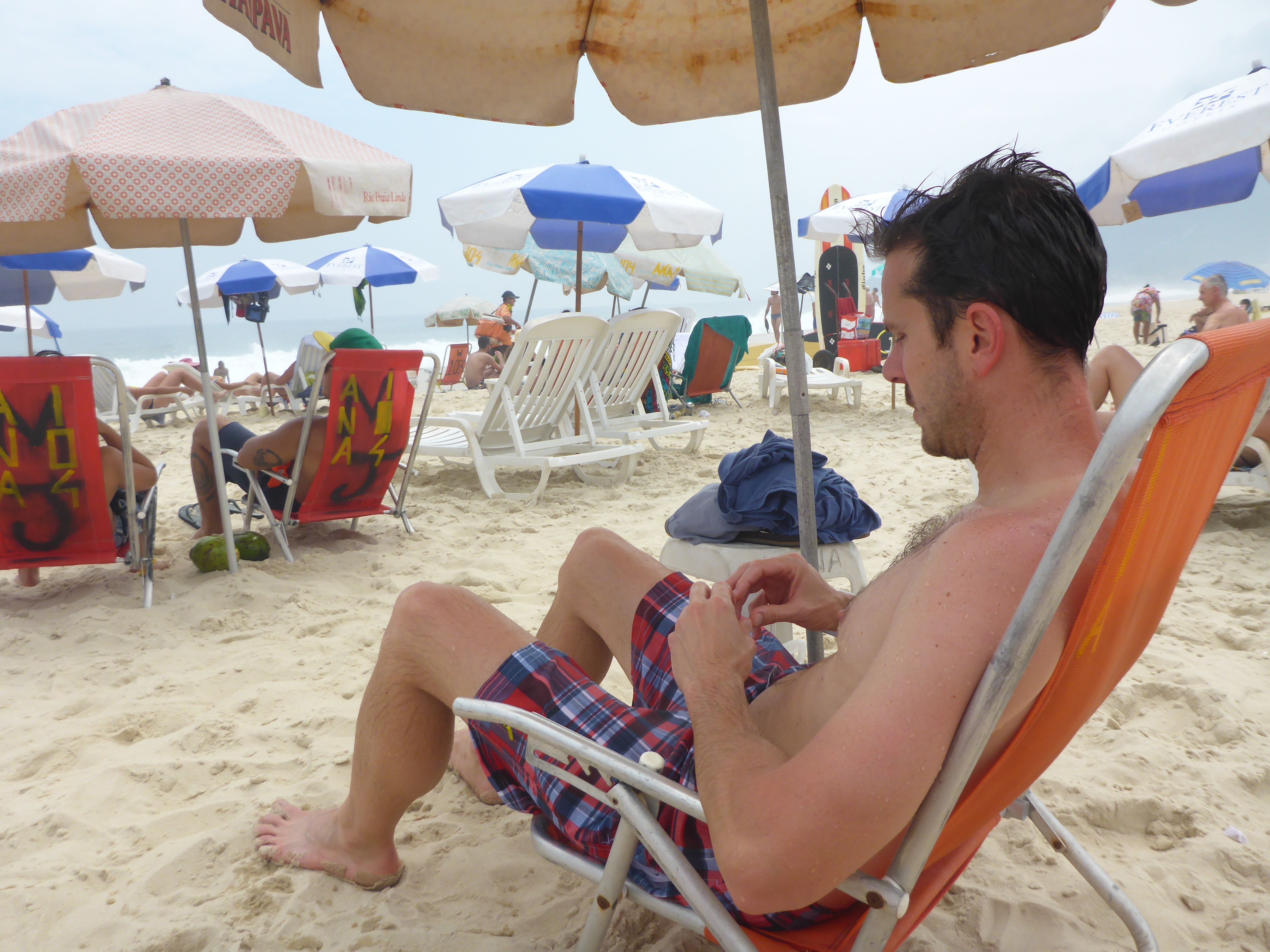 After returning the bikes we searched for lunch supplies, ending up with a banana and cheese sandwich for Wolf (confusing combination) a fried egg sandwich for me, fresh squeezed juice, and a huge brigadeiro, a bonbon-type dessert made from condensed milk and lots of chocolate. Armed with perfect beach food, we walked down to Ipanema beach and set up shop under an umbrella in the sand, taking turns jumping in the water and watching the locals selling everything from shrimp on a stick (a bit stomach-churning in the blazing sun) to bathing suits (why? every potential customer is already wearing one?) to iced mate drinks.