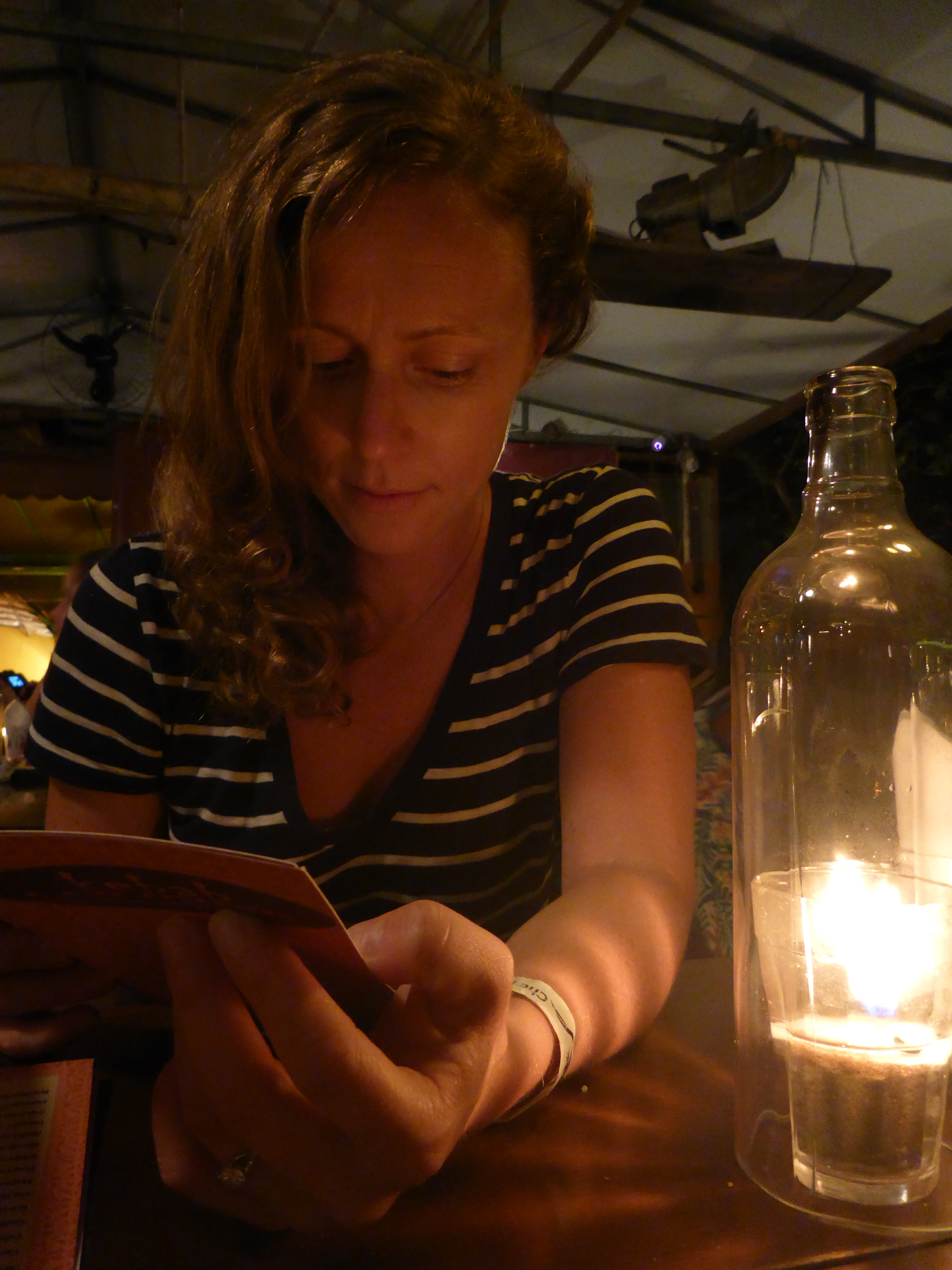 Without cards on the island, or roads for that matter, the vibe is pretty chill and the town is not all that big. Eventually we found a beach bar with Wifi and we skyped with family gathered at my Dad’s house for Thanksgiving. I was so happy to be able to chat with them, all while sitting in the sand, sipping a beer. Wolf was also able to call his parents and get updates from home as well as regale a few tales of our trip. We sat there until sunset, spending our Thanksgiving evening surrounded our new best friends – a couple of friendly stray dogs :)