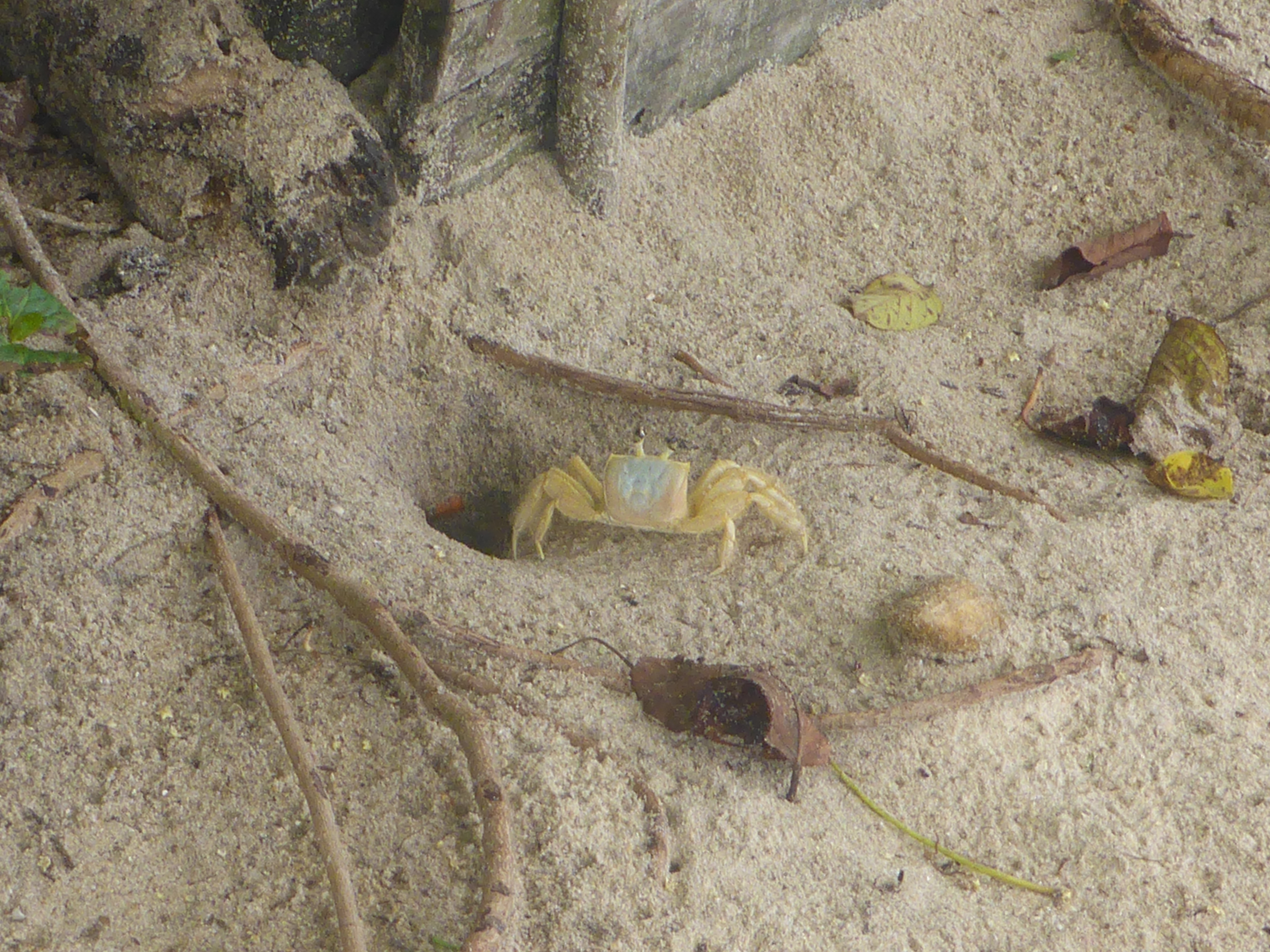 A bay a couple of miles long, rimmed with white sand and backed by the jungle-covered peaks we had just hiked… it was a perfect. And we basically had it all to ourselves, aside from a handful of folks who came and went. We found a shady spot to stash out things and then jumped in the water – the crystal clear water felt awesome after a long, hot hike. After a little swim we put together our sandwiches on the beach and hung out watching big crabs sneaking in and out of their holes in the sand all around us.