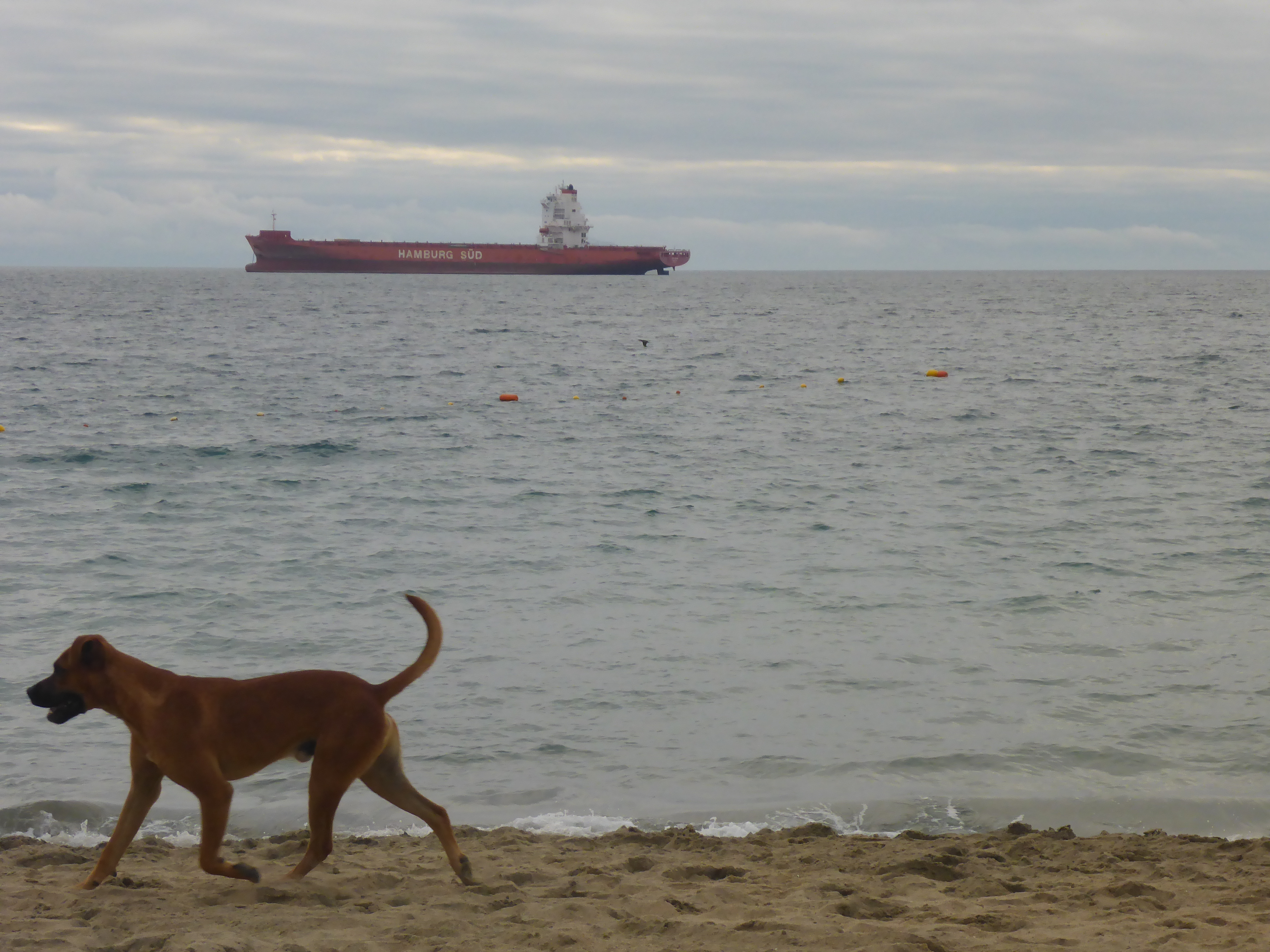 One night we brought a few adult beverages out to the beach in the evening to take in the last hour of sunshine and check out the scene. It was a little disappointing to see that this Hamburg Sud vessel which had been unloaded already… It was one of the options we had looked at when choosing a shipping company; ultimately we chose a different boat because it was scheduled to arrive a bit sooner… We toasted to our adventure anyway, enjoying the sunset and the happy dogs running along the beach.