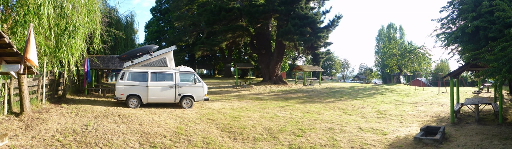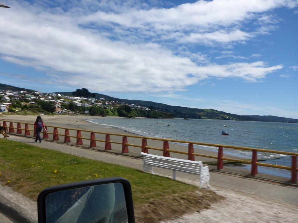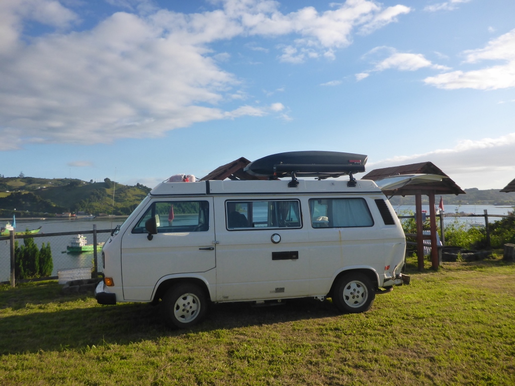 By this time we needed to start thinking about the plan for the night. After a long drive to the penguins, plus traffic delays, it would be dark soon. We decided to head back to Dalcahue, another coastal town where we had seen camping facilities, since it was near everything we wanted to see the next day. The owner was lovely and with no one else in sight, we had our pick of sites, each of which looked out over the water and across to a chain of islands.