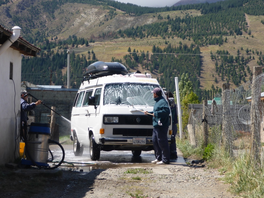 Needless to say, we weren’t loving it. Our first thought was that maybe the fuel injectors just needed a little cleaning, so we pulled over and added fuel injector cleaner to the gas tank. And it improved for a while, but eventually the hiccupping started again. Since we had just reached the town of Esquel, the northernmost point of our detour, we decided maybe it was just time to stop and give the car some TLC after all the pain we had inflicted over the last week or so. So we stopped in to see a local mechanic about changing the oil, oil filter, and fuel filter. He cleaned our air filter since he didn’t have a replacement, and his buddies gave the car a good washing.