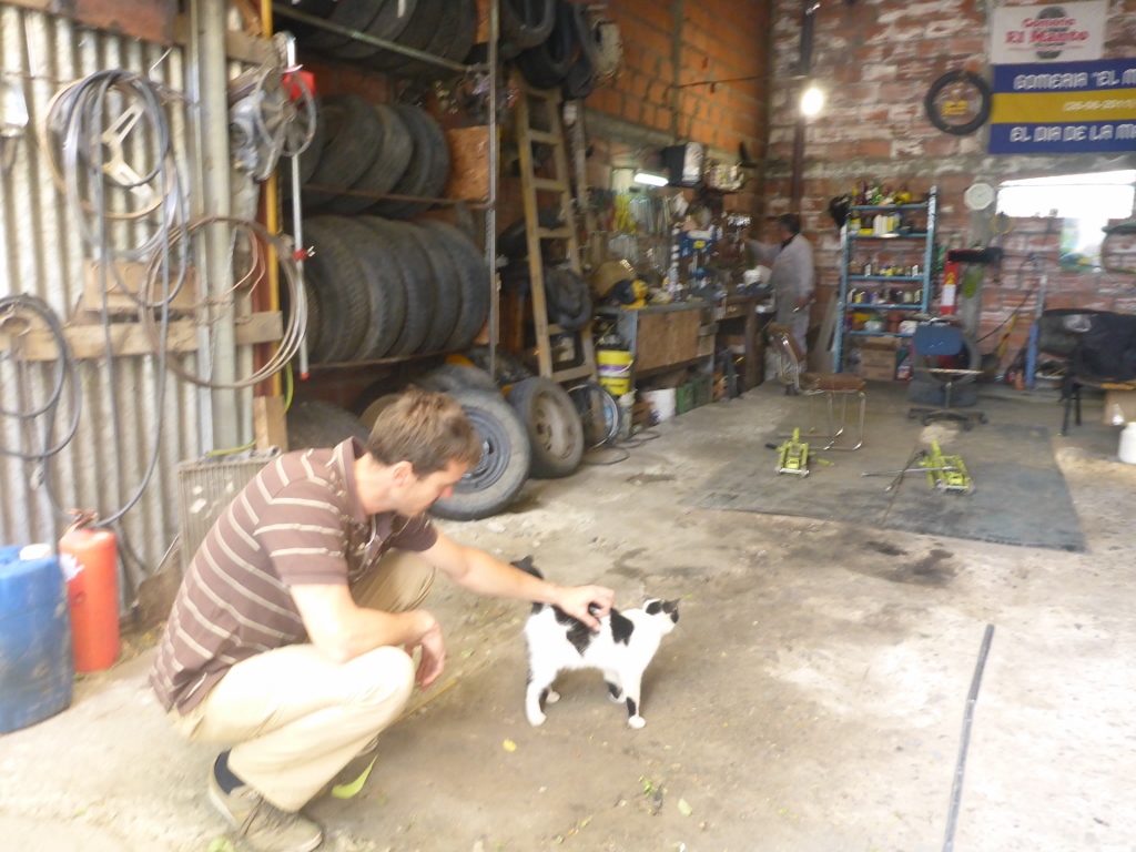 We hung out at the mechanic shop pretty much all day, Wolf’s happiest moments were spent petting the local cat. In the end, our mechanic friend told us there was no charge because he hadn’t been able to fix the problem. He probably just wanted to get rid of us. We gave him a bit of cash anyway and left without a solution. In the end, his diagnosis was that bad gas was causing our problem, but we couldn’t accept that. The idling problem had only started after we cleaned the electrical connections so something must have gone wrong then but we couldn’t figure it out. Resolving to spend another night there we found a little cabin off the main street with a parking spot just outside the front door – perfect to let Wolf do some troubleshooting the following day. I made a quick run to the hardware store when Wolf realized he needed an Ohm Meter (the poor clerk laughed as I tried to explain in Spanish what I was looking for).