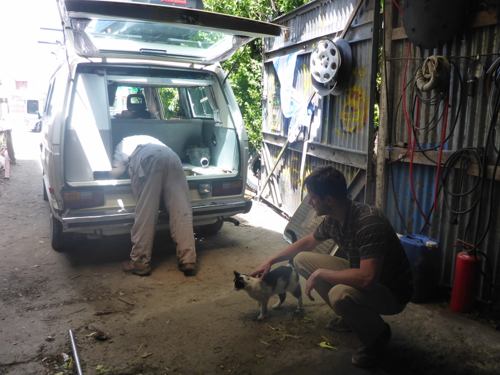 At some point, a nice German couple wandered into the shop, needing help repairing a busted side view mirror. They stayed and chatted with us for a while. Commiserating about the terrible roads, telling stories about their car trouble while travelling in Africa, and laughing about their US tour in a Vanagon during the 70s. They asked us over and over again if we were ok on money and did we need help paying for any repairs we needed. They made us feel better and reassured us that what we were doing was just part of the fun of travel :)