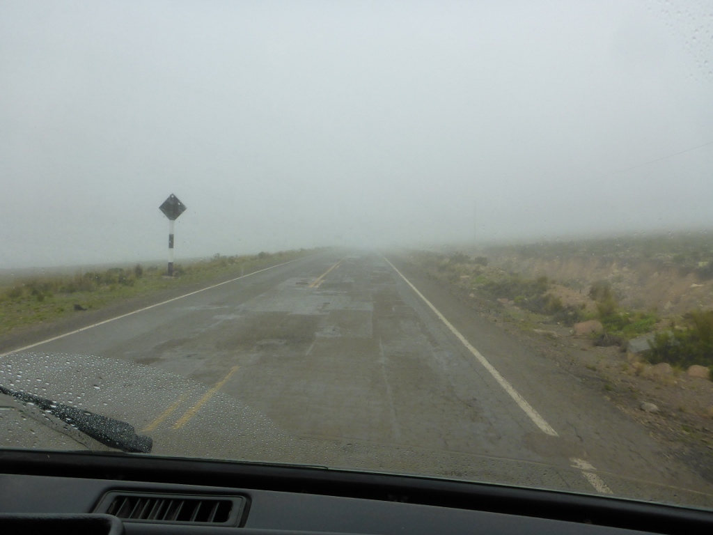 Eventually, the road climbed back up to nearly 5,000 meters and suddenly we were back in the clouds, with minimal visibility.